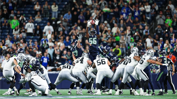 Seattle Seahawks linebacker Jalan Gaines blocks Las Vegas Raiders kicker Daniel Carlson's field goal attempt Thursday at Lumen Field.